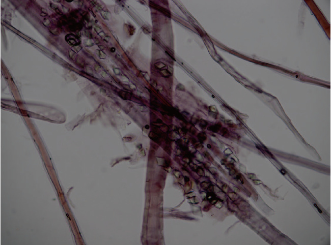 構(gòu)皮紙還有一個非常重要的特征是除纖維細胞外,紙張纖維中還能見到大量的草酸鈣晶體(如圖4),多呈菱形或者正方形,常存在于薄型細胞的腔內(nèi)或者細胞與細胞之間,造紙過程中的打漿和漂洗程序會使草酸鈣晶體流失,因而一些制作精細的構(gòu)皮紙中殘留的草酸鈣晶體相對少見。